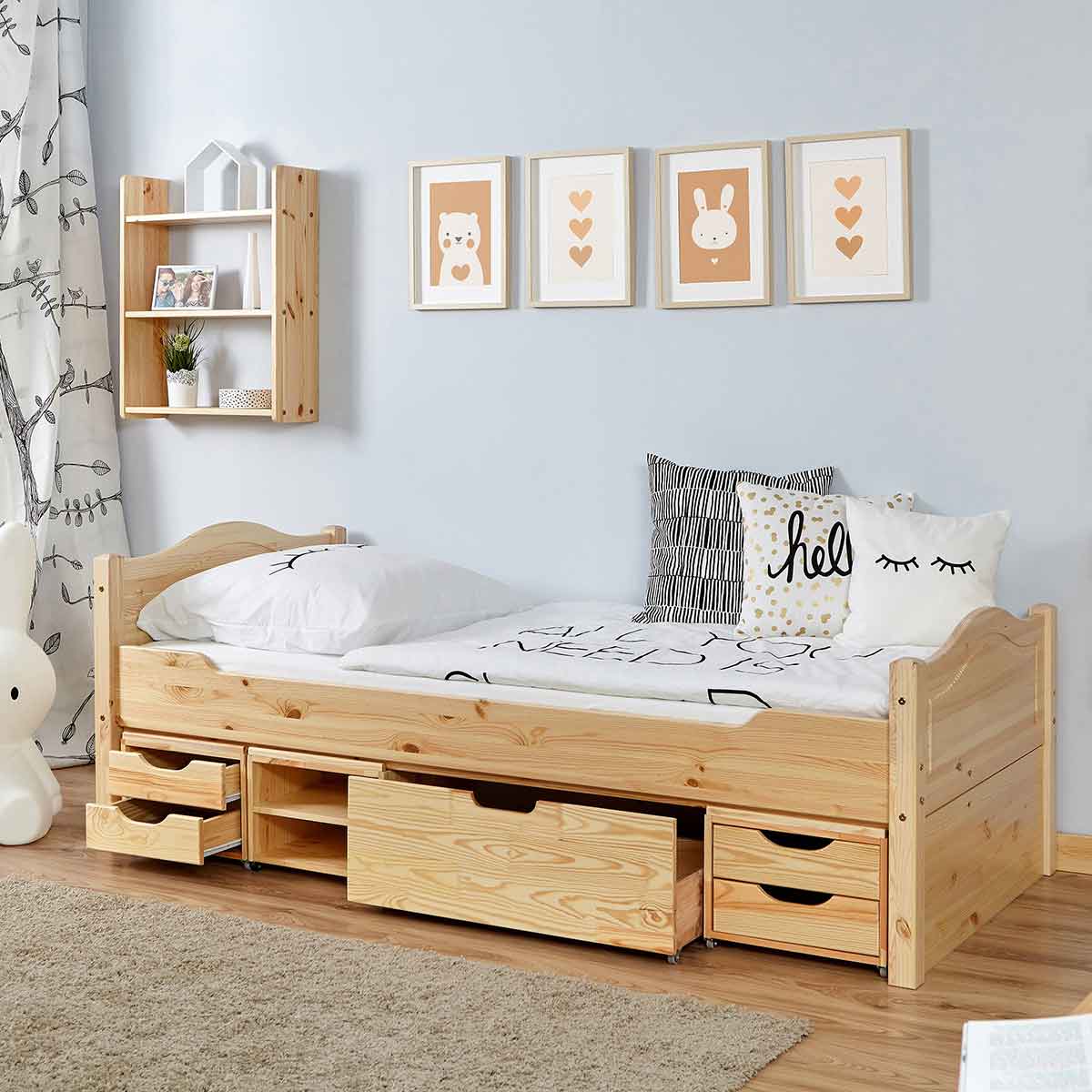 Ticaa Einzelbett Leni mit 4er Funktionsschubkasten Kiefer - 120x200 cm