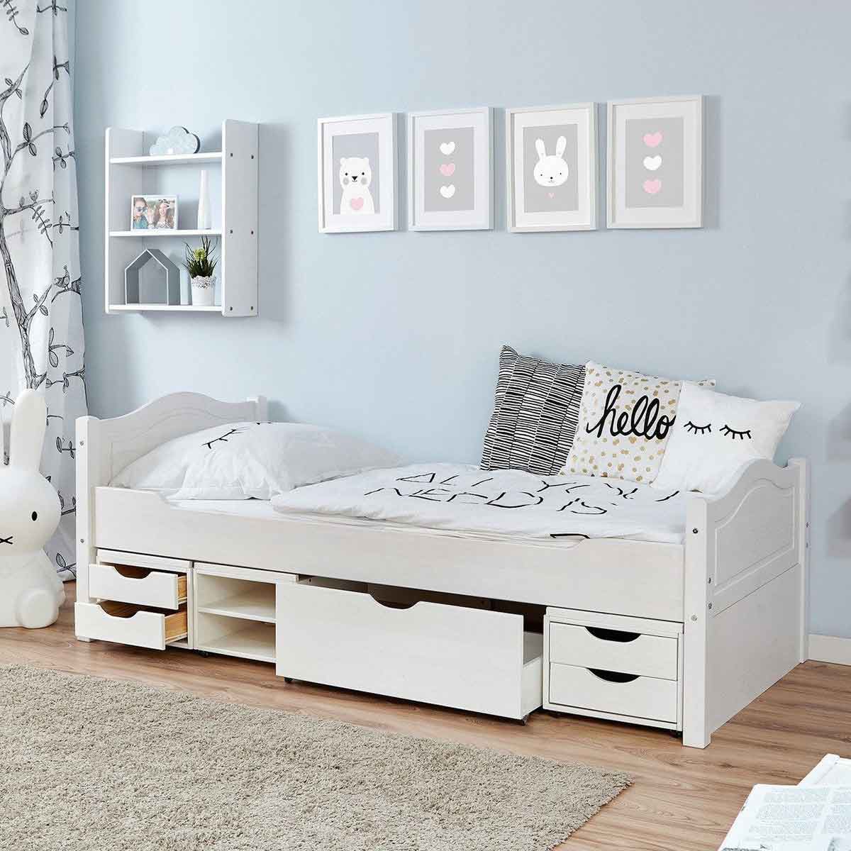 Ticaa Einzelbett Leni mit 4er Funktionsschubkasten Kiefer weiß - 120x200 cm