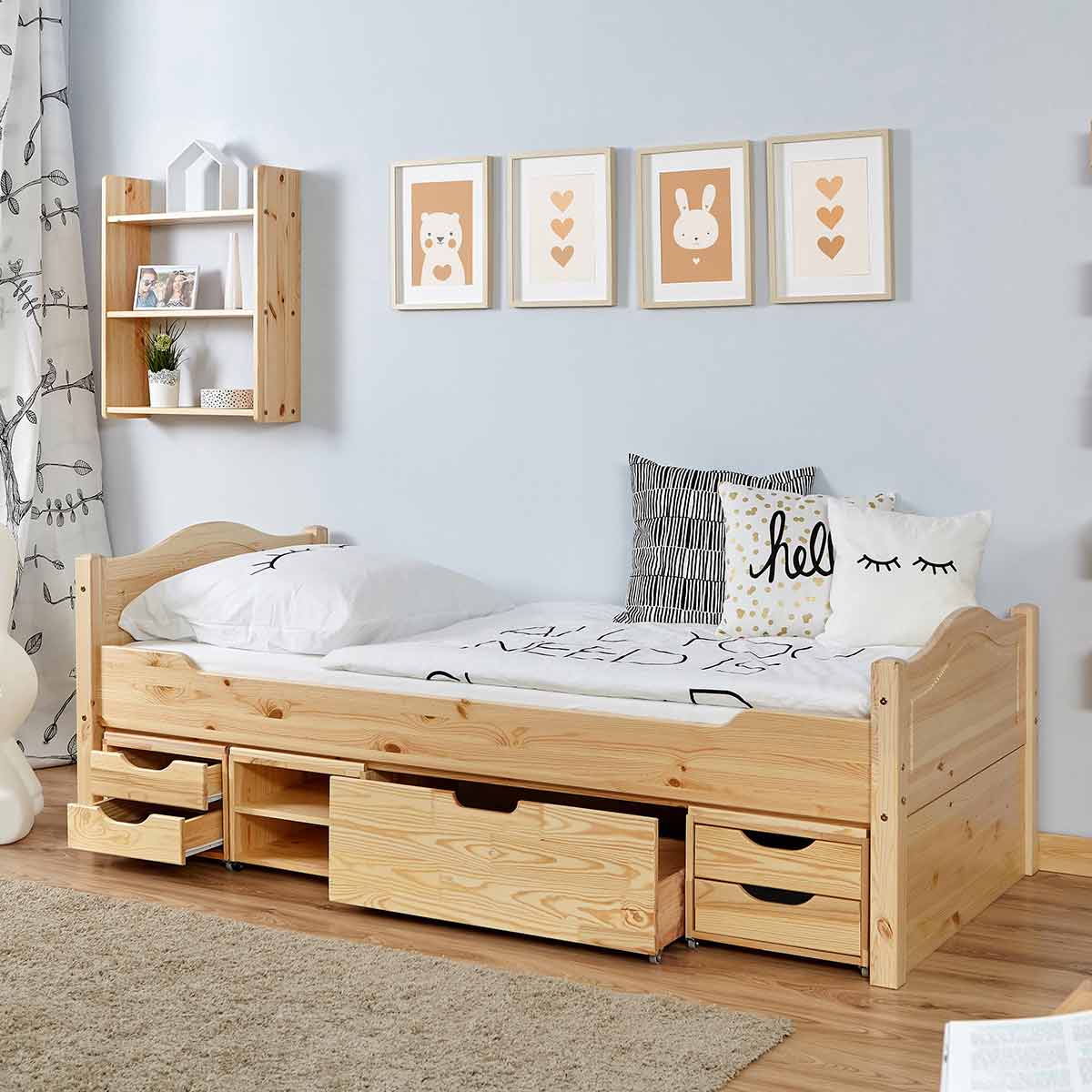 Ticaa Einzelbett Leni mit 4er Funktionsschubkasten Kiefer - 100x200 cm